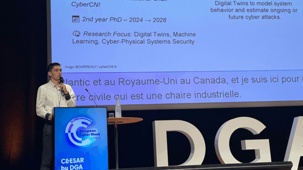 La Chaire CyberCNI.fr revient sur C&ESAR 2025, la conférence de cybersécurité organisée par la Direction Générale de l’Armement (DGA) dans le cadre de l’European Cyber Week à Rennes. Parmi les interventions remarquées de cette édition, celle de Hugo Bourreau, doctorant en co-tutelle entre l’IMT Atlantique (France) et l’Université du Québec à Chicoutimi (UQAC) (Canada), a particulièrement attiré l’attention.